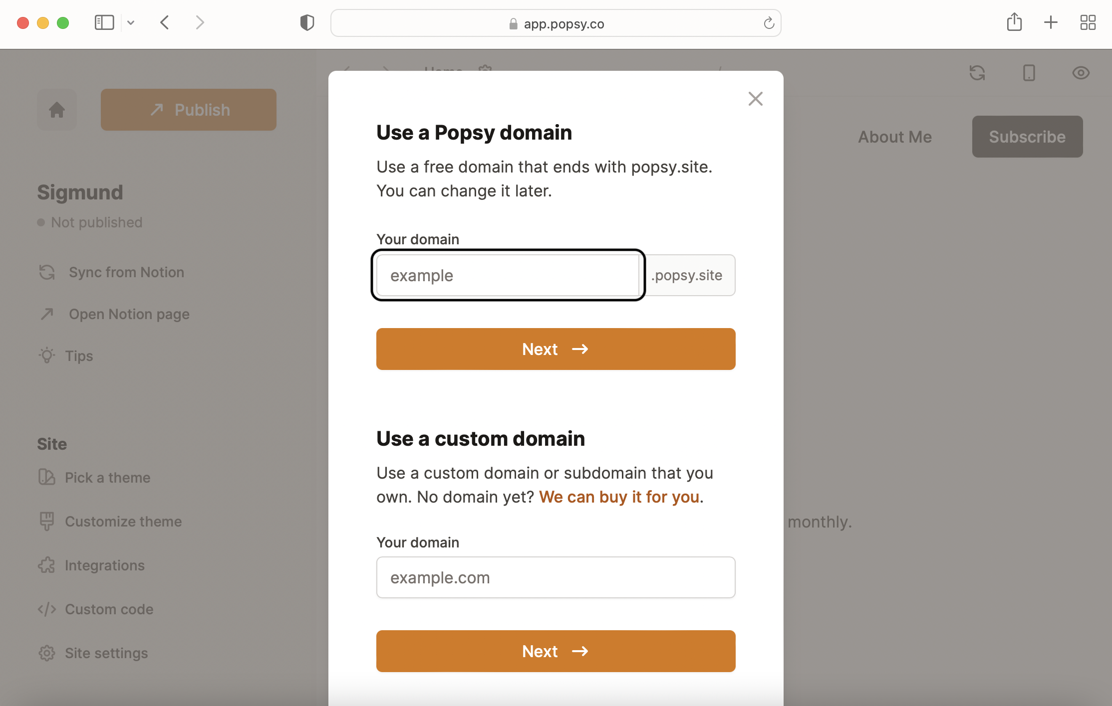 With our completely free Popsy domains, we enable users the fastest way of publishing their Notion website. You don’t even need a custom domain and your site can be live instantly.