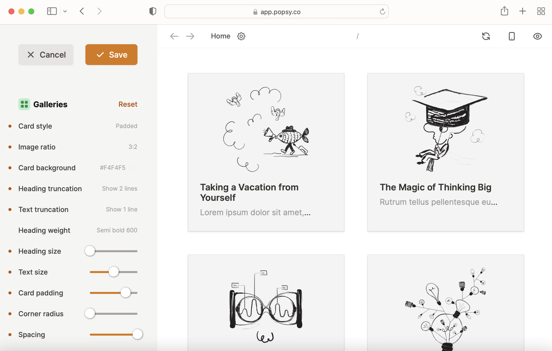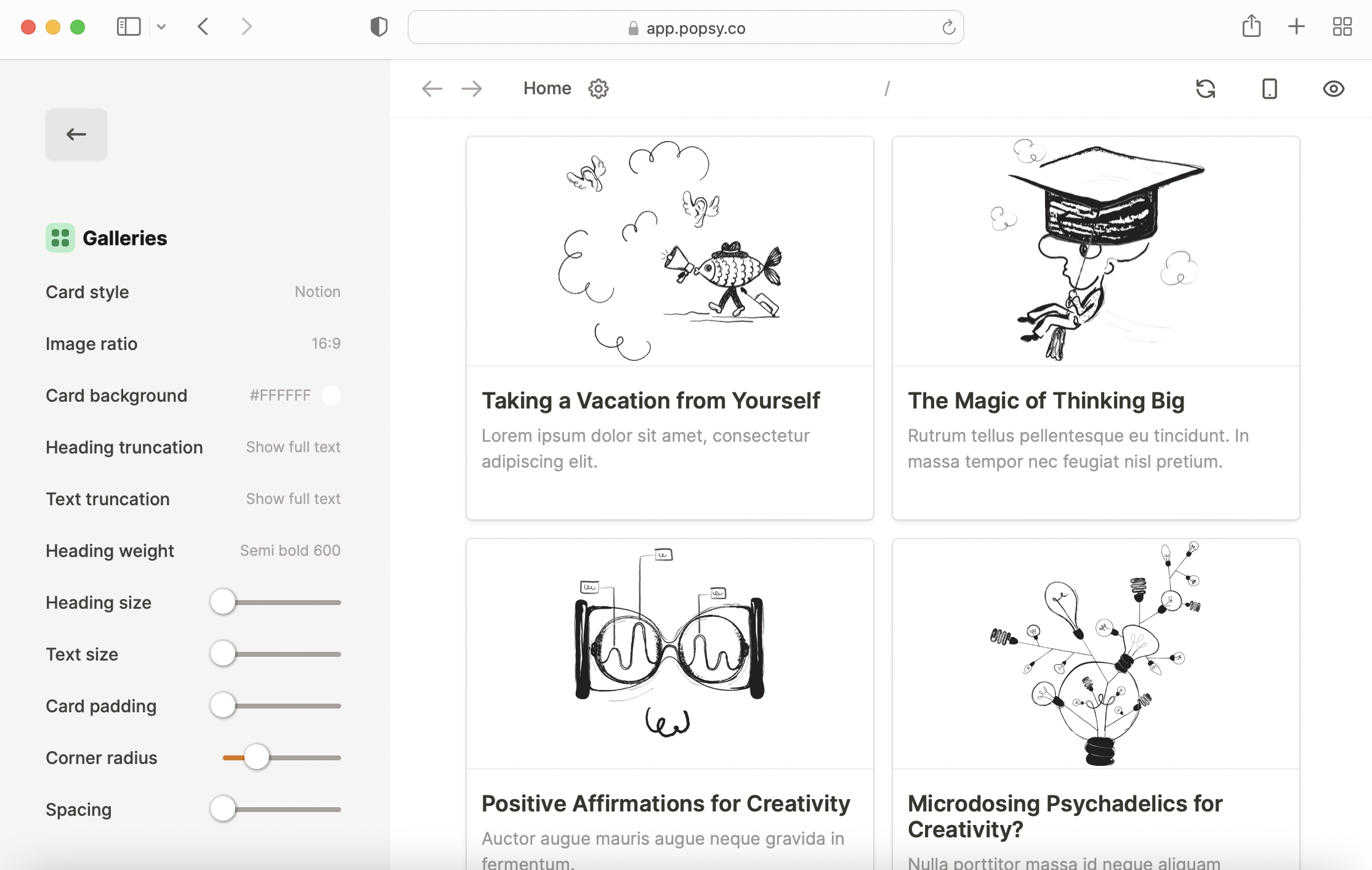 To start customizing galleries on your Notion website, open the Customize theme menu in Popsy and scroll down to Galleries. You will see lots of different customization options.