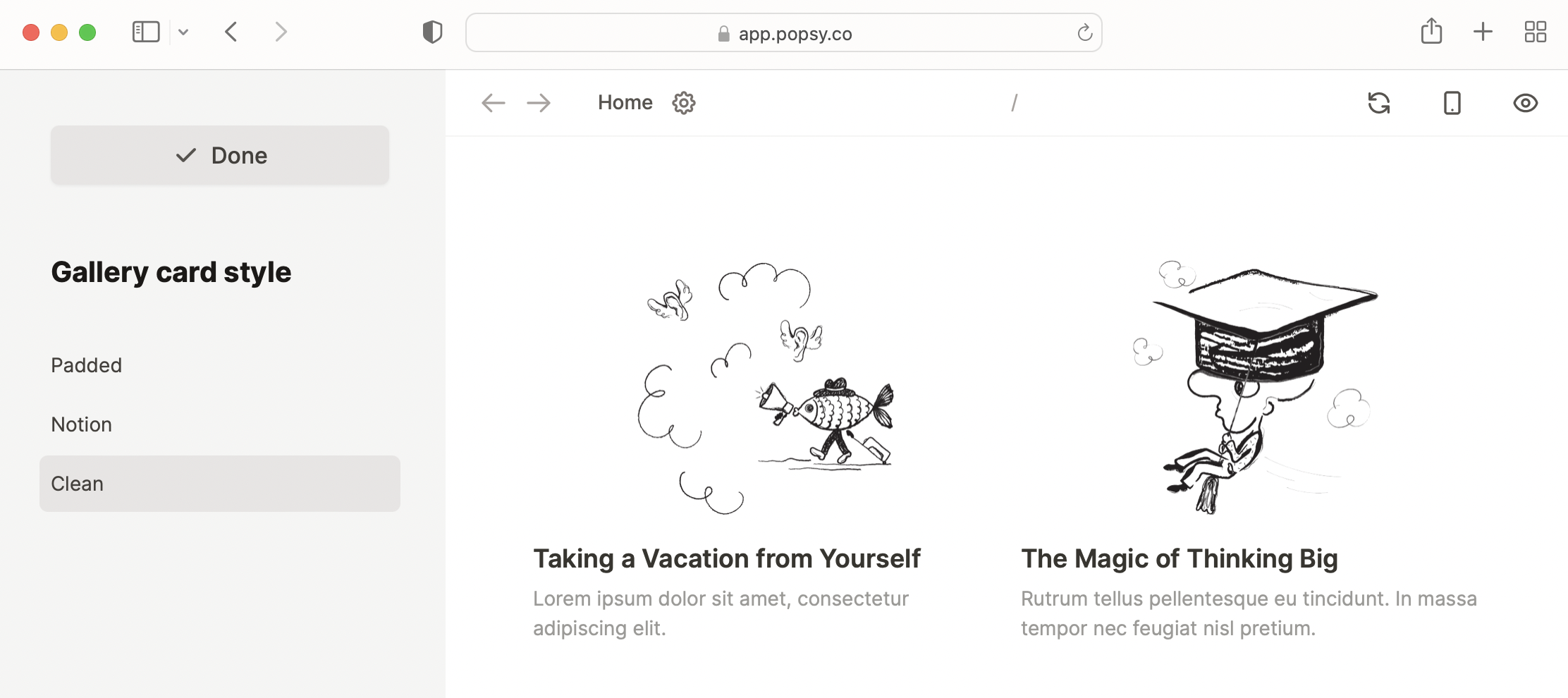 To customize the gallery card style of your Notion cards, go to Popsy and open the Customize theme menu. Scroll down to Galleries where you’ll find Card style customization.