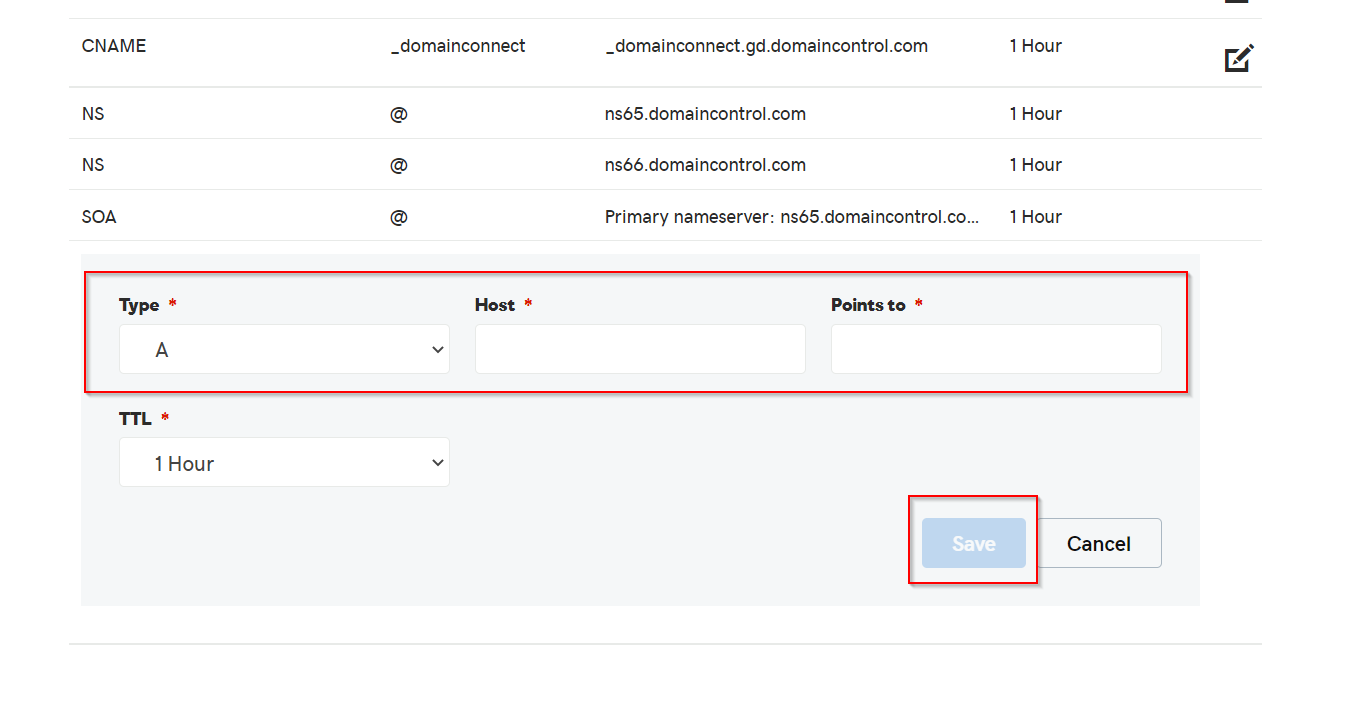 Go to GoDaddy and choose option A under Type and type in @ under Host. Paste the value you copied from Popsy under Points to. Click Save. The first record is now set up.