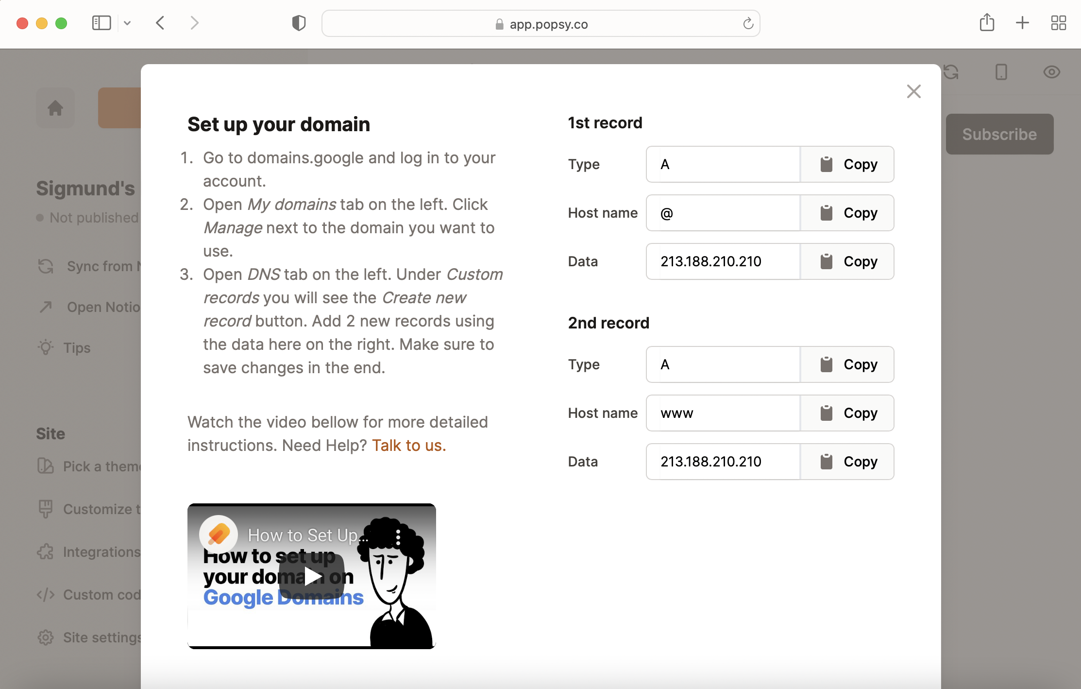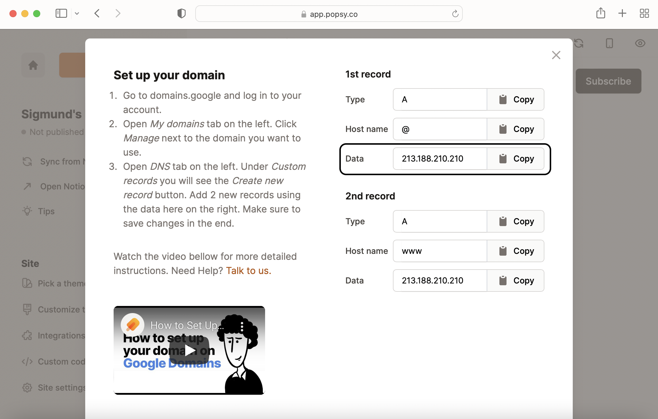 Go back to Google Domains. Choose option A under Type and type and paste the value you copied from Popsy under Data. Leave the field Host name empty. Click Save. The first record is now set up.