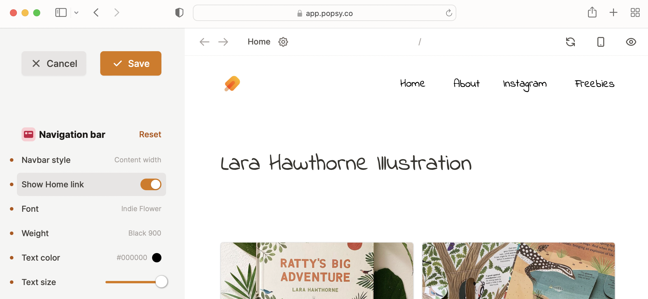 To add a home link, simply enter the Customize theme menu in Popsy and scroll down to find the Navigation bar. By toggling the Show Home link on, Popsy will automatically add it to your navigation bar. Confirm all changes with the Save button. You now have a functional home link.