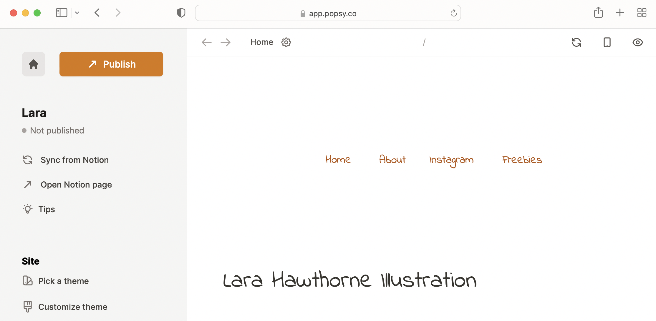 With Popsy you can simply add a logo to your Notion website and customize it. All you have to do is open your page in Popsy and go to the Customize theme menu.