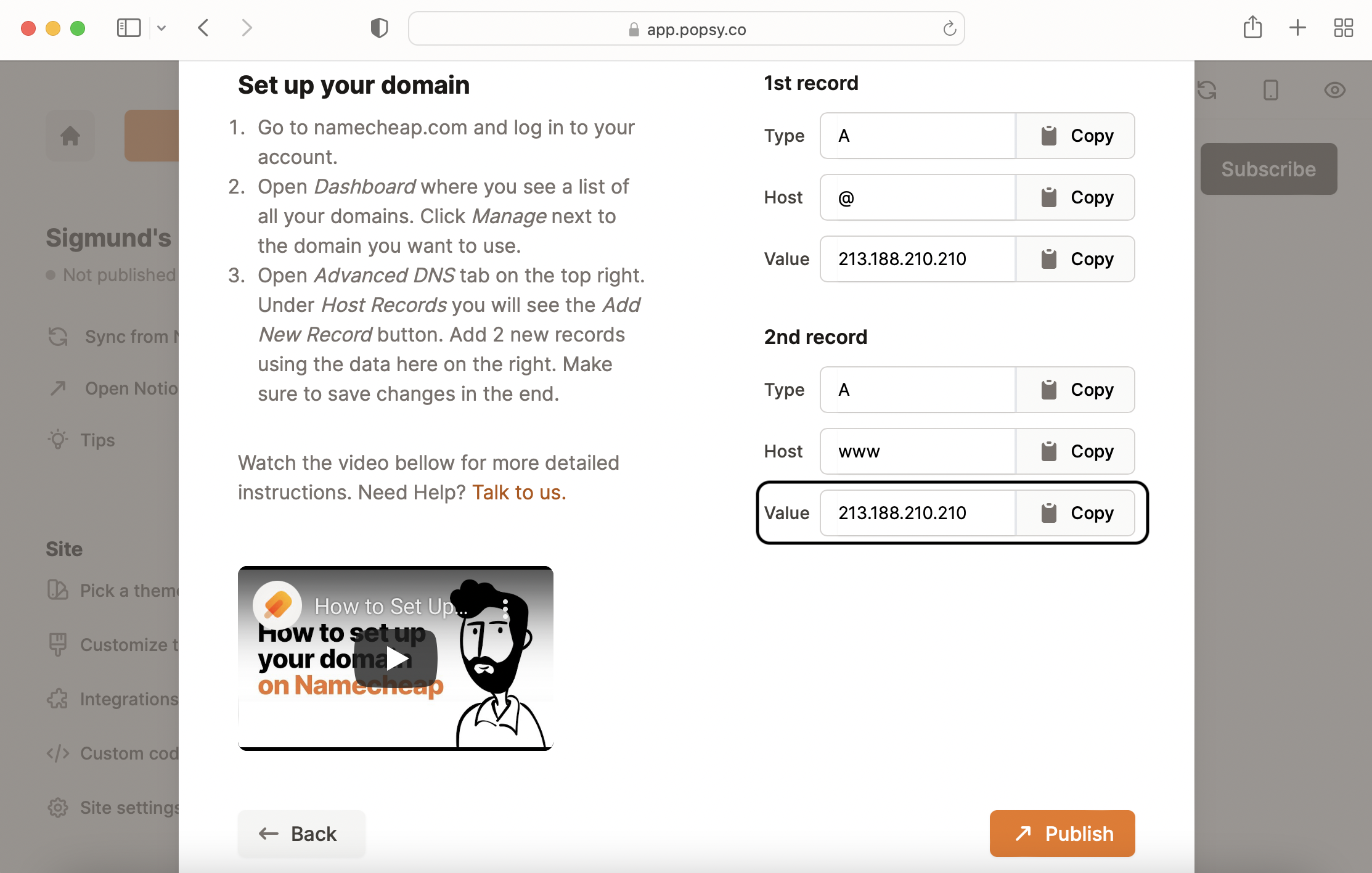 Click Add New Record button again. Choose the option A record under Type and type in www under Host. Paste the value you copied from Popsy under Value. Click the green tick icon on the right. The second record is now set up.