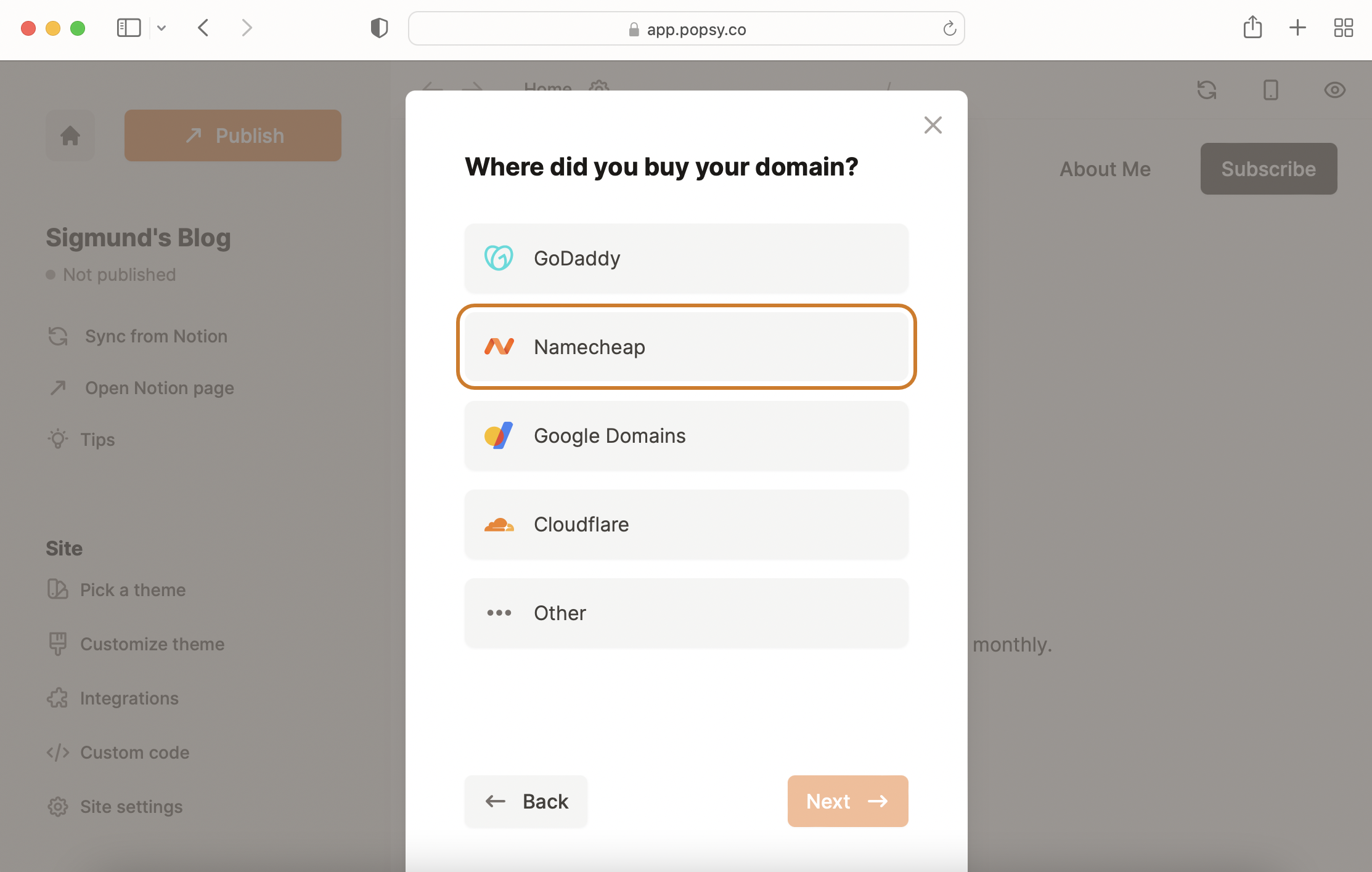 Open a new tab in your browser and go to Namecheap. Log in to your account and go to Dashboard. Here you will see a list of all domains that you own. Click Manage on the right side of the domain you want to use.