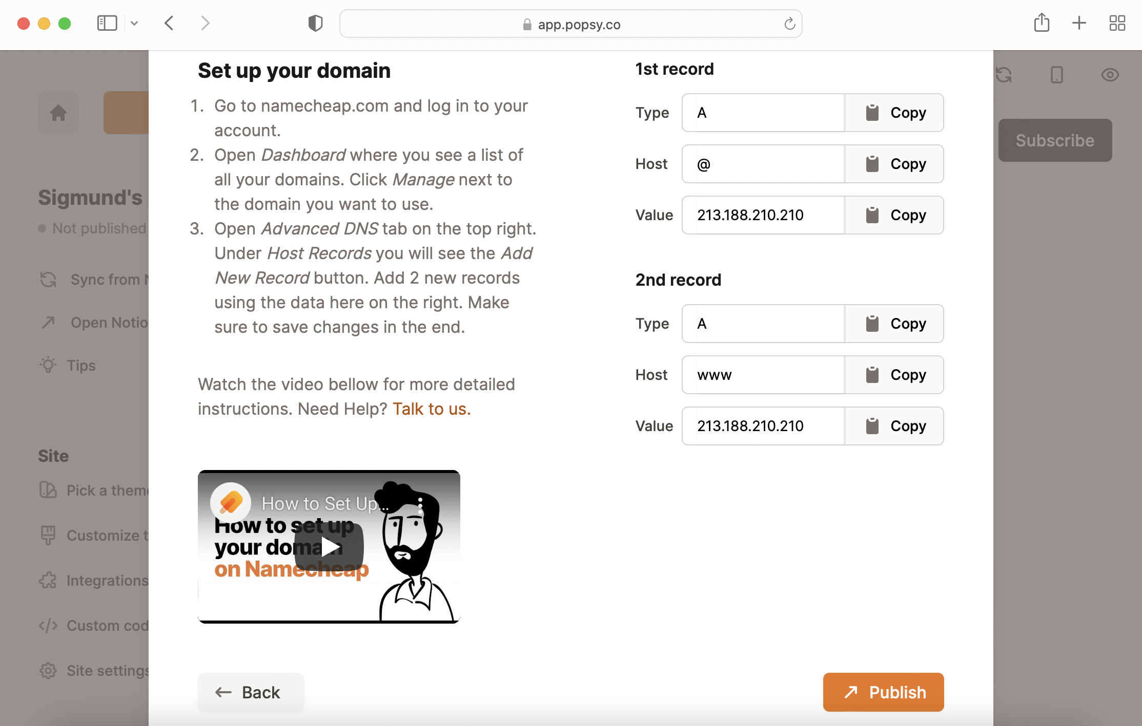 Go to Namecheap and choose the option A Record under Type and type in @ under Host. Paste the value you copied from Popsy under Value. Click the green tick icon on the right. The first record is now set up.