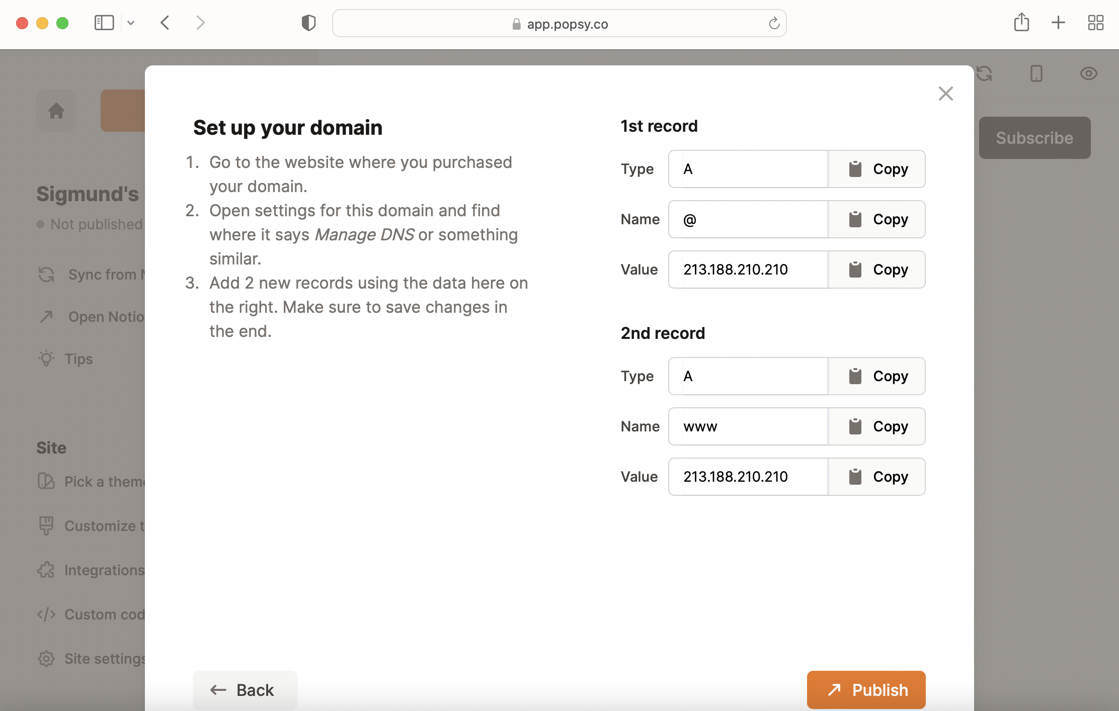You will see a list of 2 records on the right.* These are so-called DNS records that you will add to your domain in the next steps.
