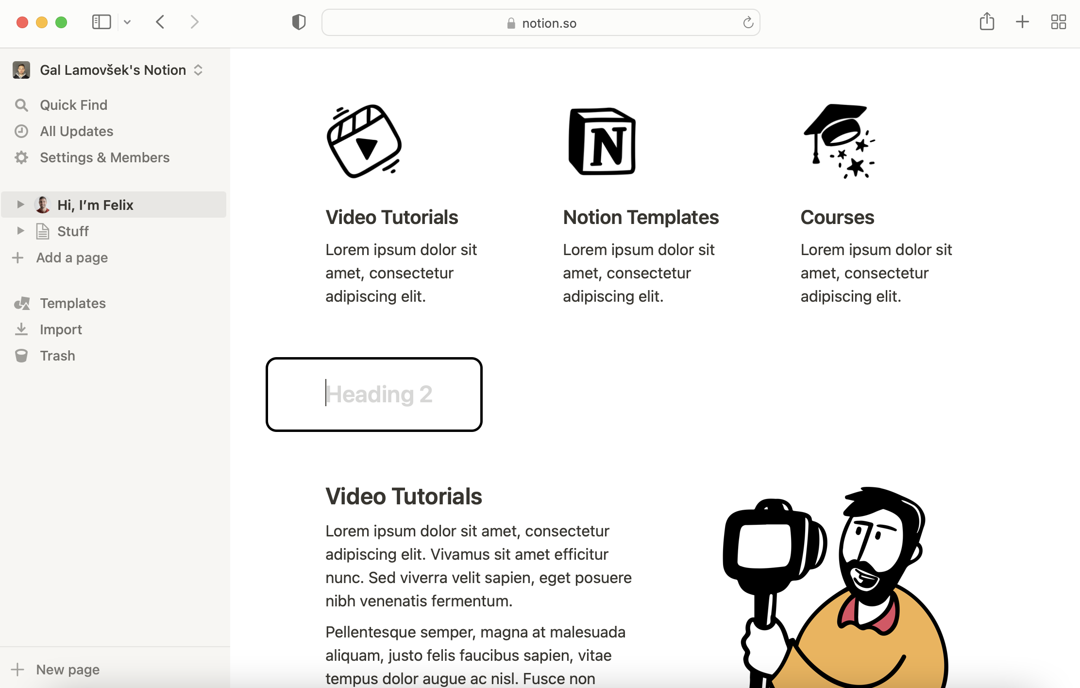 To create a new section in Popsy, all you need to do is add the heading (/h1, /h2, or /h3) in Notion where you want the section to be. In Notion it looks like this: