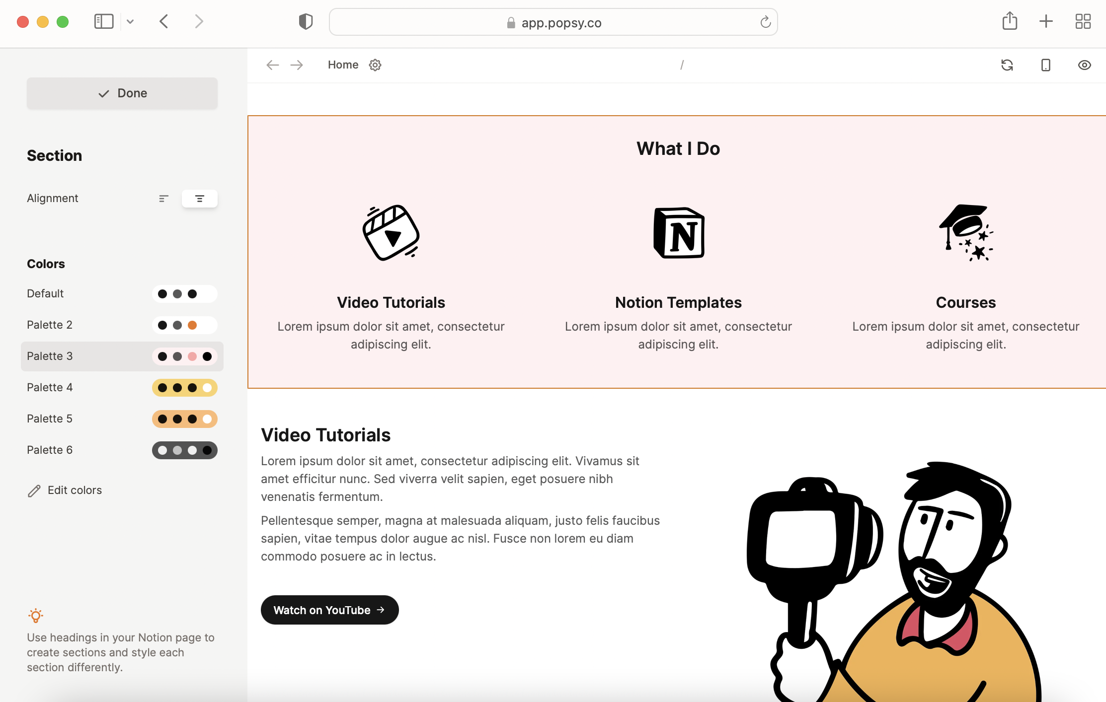 And in Popsy there are two sections now. You can customize them separately as you like. On the left, in the menu, you can change alignment. And you can also use predefined color palettes or edit colors as you like. This is what it looks like in Popsy: